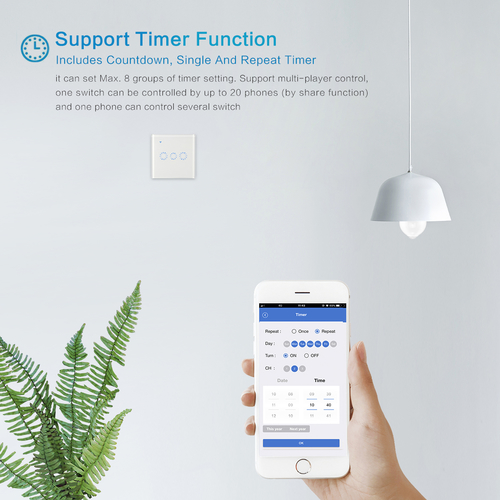 The touch switch panel supports timer function that includes countdown, single and repeat timer, it can set Max. 8 groups of timer setting. It also supports network off work function, the timer setting can work as usual even if the network is shutting down.