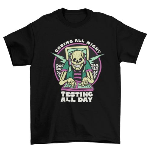 Awesome t-shirt design that features a skeleton that is programming, in neon colors
